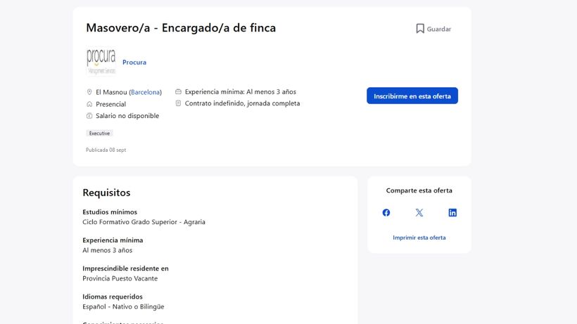 Hij Leuke stad van Masnou18 kilometer van Barcelona, het heeft een ideale werkmogelijkheid voor werkloze of actieve werknemers die een 180 graden wending willen nemen naar hun arbeidsleven en in volle positie beginnen. Via een vacature die een paar dagen geleden werd gepubliceerd in infojobs, de Human Resources Company zoekt managementdiensten Kondigt er een aan vacature met gratis accommodatie (onafhankelijke huis van de boerderij waarin u werkt) en Onbepaalde contract.