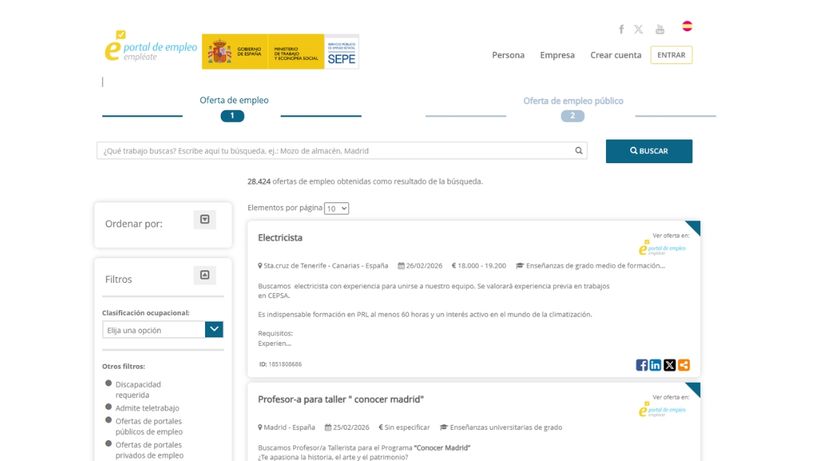 Om het CV naar een van de door de SEPE gepubliceerde vacatures te sturen, moet u eerst naar het portaal gaan'werk krijgen' en gebruik de filters om de type werkdag, contract en zelfs eerdere ervaring. Nadat deze eerste stap is voltooid, klikt u op de naam van de vacature en worden de arbeidsvoorwaarden weergegeven.