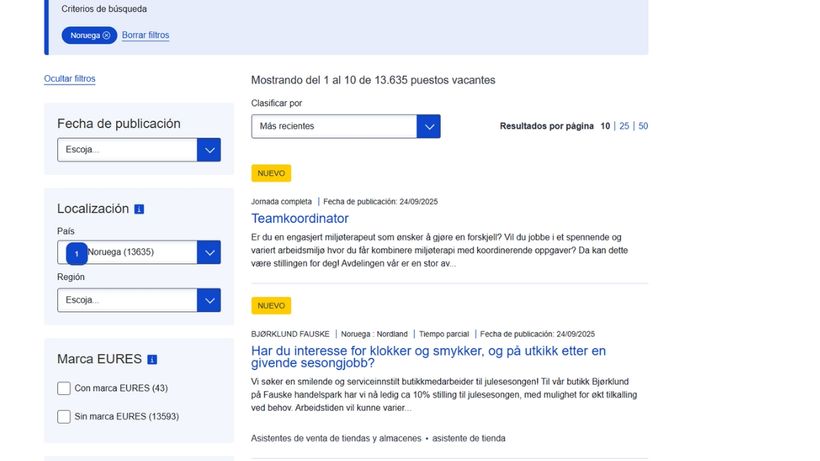 Het Eures -netwerk publiceert duizenden nieuwe vacatures in Noorwegen daarvan 4.533 zijn zonder eerdere ervaring, 6.481 waardevol voor het geval het tot 1 jaar is geweest, 2.376 wanneer het tussen 2 en 5 jaar is en in andere is het niet gespecificeerd.